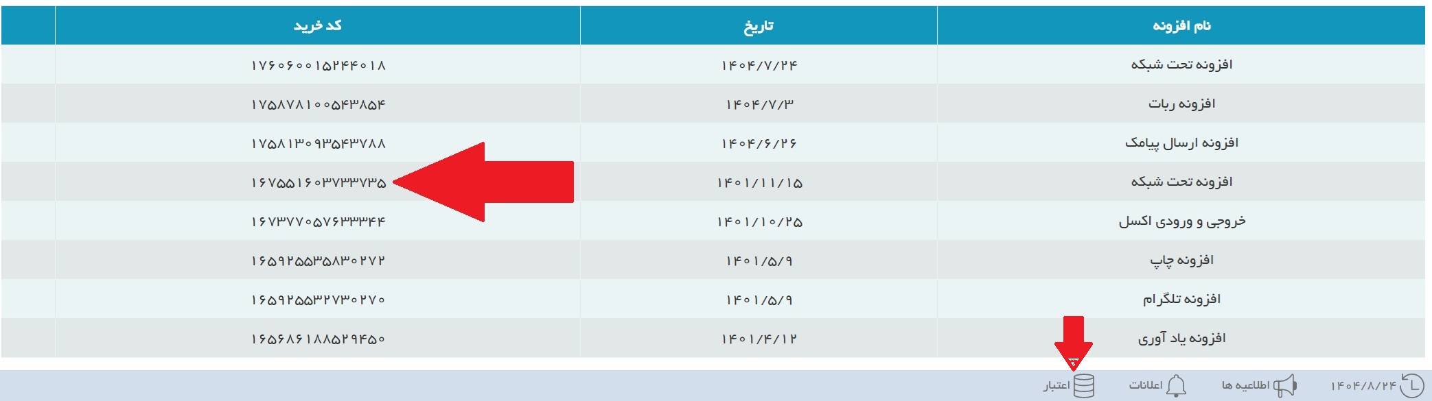 پس از نصب بر روی کامپیوتر فرعی کد خرید افزونه را باید وارد کنید، جهت دریافت کد خرید دکمه اعتبار واقع در نوار پایین نرم افزار را بزنید. ( مهم: هر کامپیوتر را که شبکه می کنید کد خرید همان کامپیوتر را در جایی یادداشت کنید.)